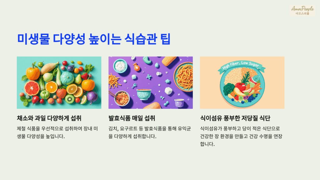 • 제철 과일과 채소, 해조류, 콩류, 통곡물은 미생물 다양성을 유지하는 데 핵심입니다.