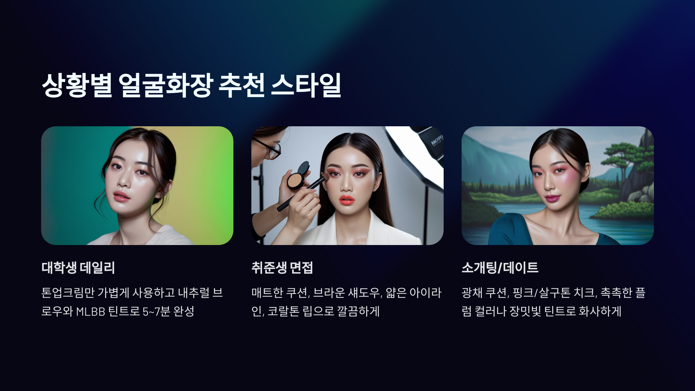 - 섀도는 쿨베이지 + 라벤더, 립은 쿨핑크 or 플럼 계열
